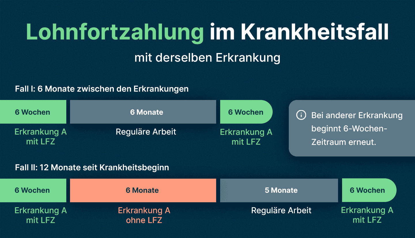 - Neue Krankheit: Pro Krankheit steht Arbeitnehmern eine Lohnfortzahlung von 42 Kalendertagen zu. Beschäftigte, die länger als 6 Wochen krank sind, erhalten auch bei gleicher Krankheit weiterhin Entgeltfortzahlung, sofern 6 Monate zwischen den Erkrankungen liegen oder der Beginn der ersten Arbeitsunfähigkeit bereits 12 Monate zurückliegt.